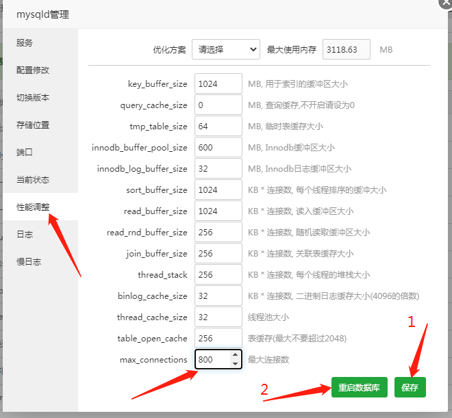 修改mysql性能中最大连接数为800,